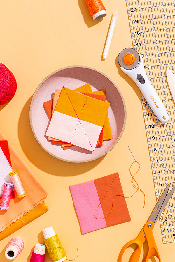 The technical workflow begins with the preparation of materials. Practitioners are instructed to cut five-inch squares from various hues of quilting cotton, including seasonal palettes of orange, terracotta, light pink, apricot, and deep pink. This phase relies heavily on the Fiskars 45mm Stick Rotary Cutter and the 18” x 24” Cutting Mat, tools designed to provide the geometric precision required for successful patchwork.